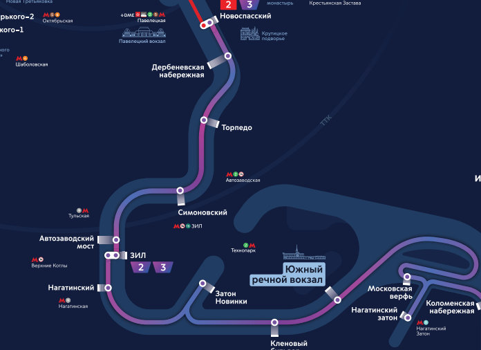 Расписание публикуется каждый день и в режиме онлайн доступно на сайте «Московского транспорта». Длина маршрута 5,4 км. Позволяет за ~55 минут добраться от центра до бывшей промзоны, минуя пробки. На причале «ЗИЛ» доступна пересадка на маршрут №2 (ЗИЛ — Печатники). Ближайшая станция к причалу «Новоспасский» — «Пролетарская» или «Крестьянская застава».
