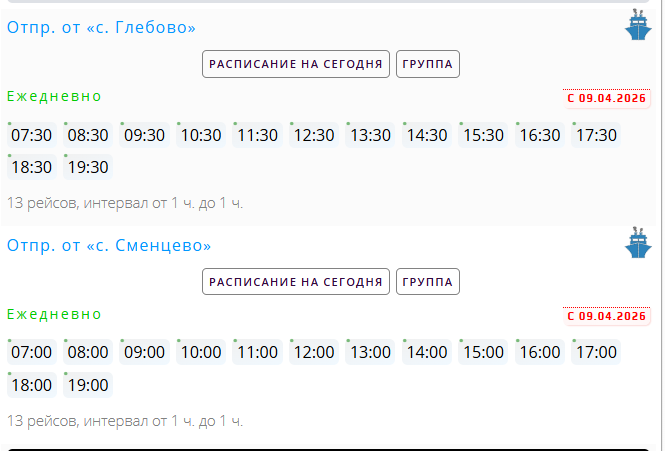 по понедельникам, вторникам и четвергам с 1 июня по 31 июля. Время отправления от начального пункта — 08:00, 19:00. От конечного — 08:30, 19:30.