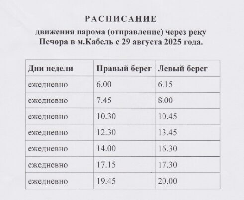 Движение парома через реку Печора в м. Кабель. Расписание с 29 августа 2025 года