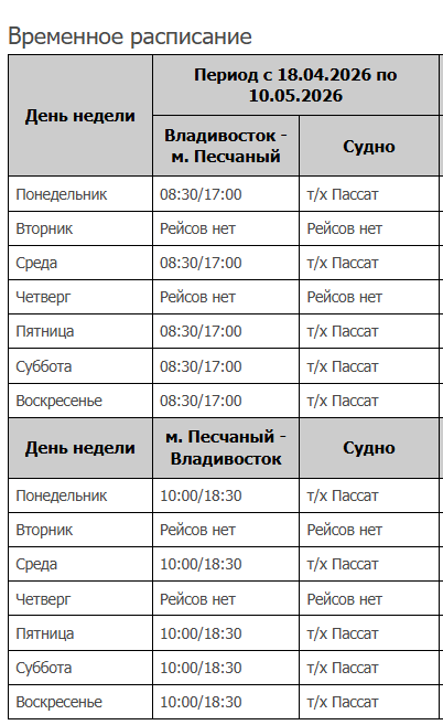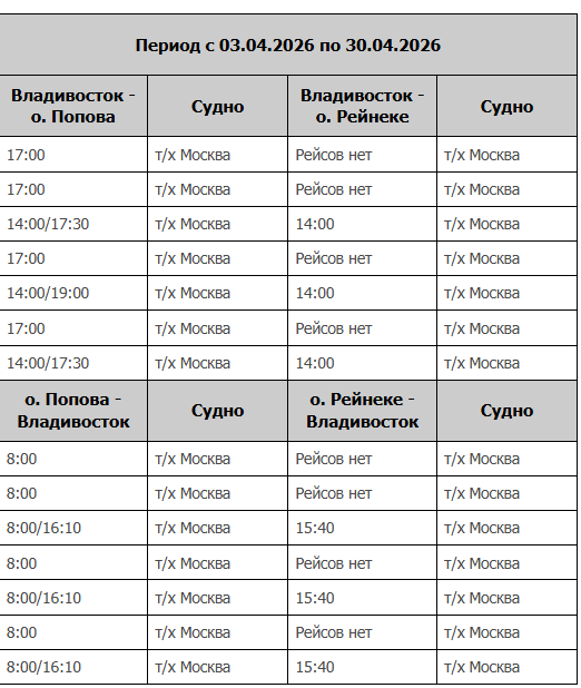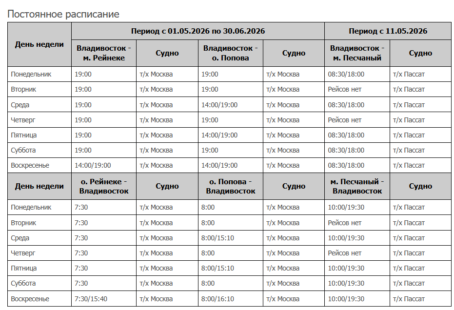 Время отправления из Владивостока: 14:00 (везде с остановкой на острове Попова и далее на Рейнеке).